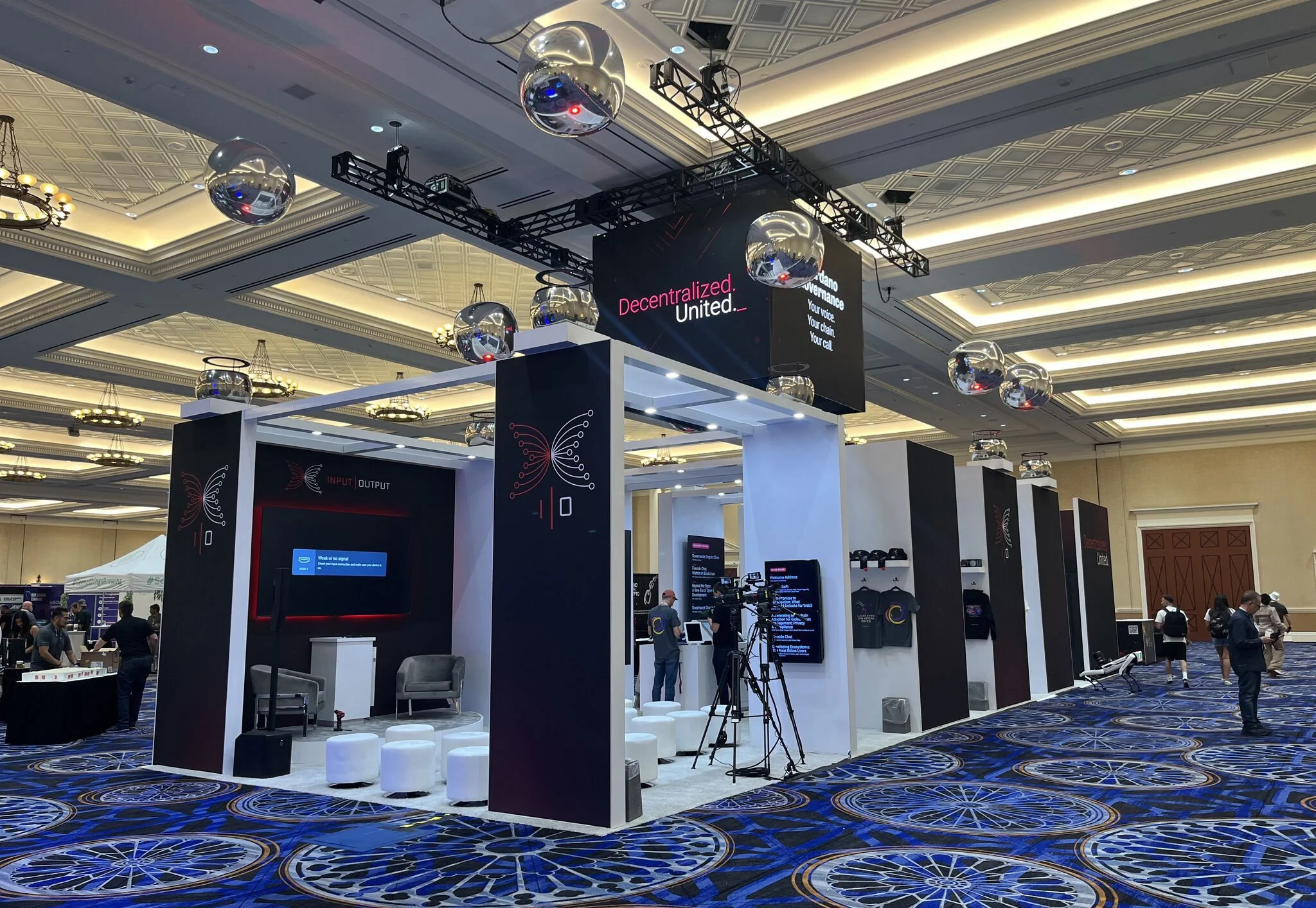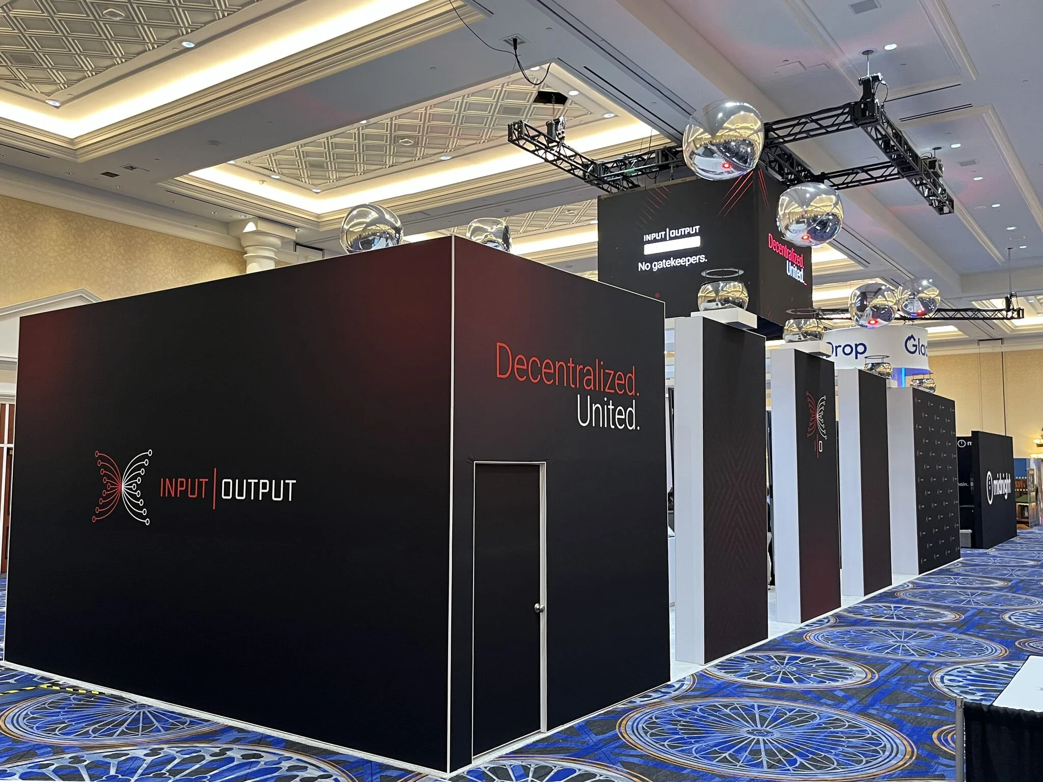 Challenge The challenge was to design a space capable of hosting a high density of activity while remaining clear, legible, and engaging. The IO Village needed to support multiple programmes simultaneously — speaker sessions, podcasts, live-streamed content, demos, and social interaction — while communicating a complex ecosystem spanning privacy, scalability, interoperability, and governance. The design had to cut through a busy exhibition environment and sustain attention over long dwell times.
